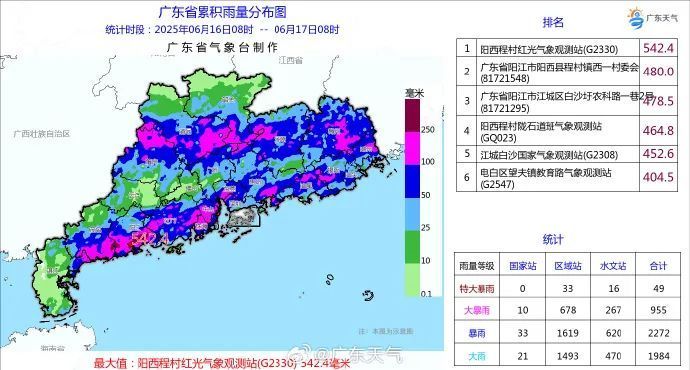据@广东天气 消息:今天(17日)广东仍有暴雨到大暴雨局部特大暴雨;预计18日起,广东降水逐渐减弱。