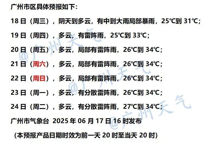 据广州市气象台预测:目前广州市有小到中雨。预计今天17-19时下班高峰期,广州市区有中到强雷雨。雨时能见度较差,道路湿滑,请注意交通安全。(广州市气象台2025年06月17日16时发布)