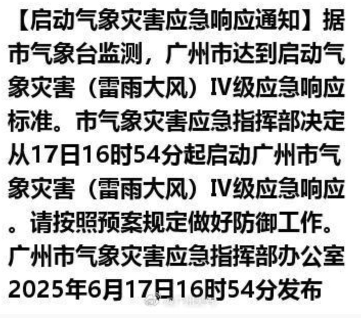 据广州市气象台监测,广州市达到启动气象灾害(雷雨大风)Ⅳ级应急响应标准。市气象灾害应急指挥部决定从17日16时54分起启动广州市气象灾害(雷雨大风)Ⅳ级应急响应。请按照预案规定做好防御工作。广州市气象灾害应急指挥部办公室2025年6月17日16时54分发布